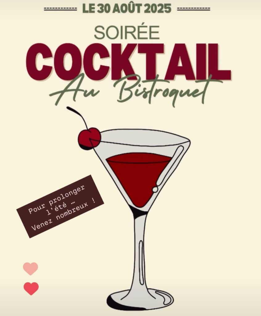 Samedi 30 août : soirée cocktail à partir de 18h