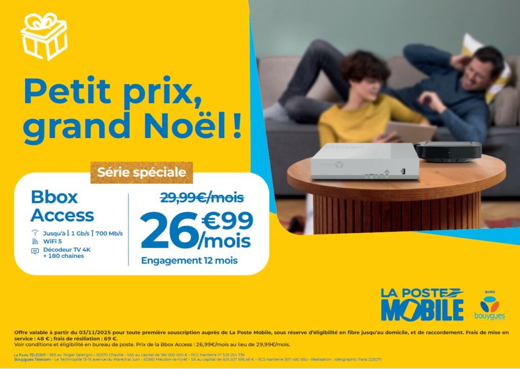 Série spéciale Noël : La Bbox Access est au prix de 26,99€/mois, même après 12 mois, au lieu 29,99/mois (engagement 12 mois) : l’essentiel accessible à tous ! Comprend abonnement téléphone fixe, box internet et 180 chaînes TV.