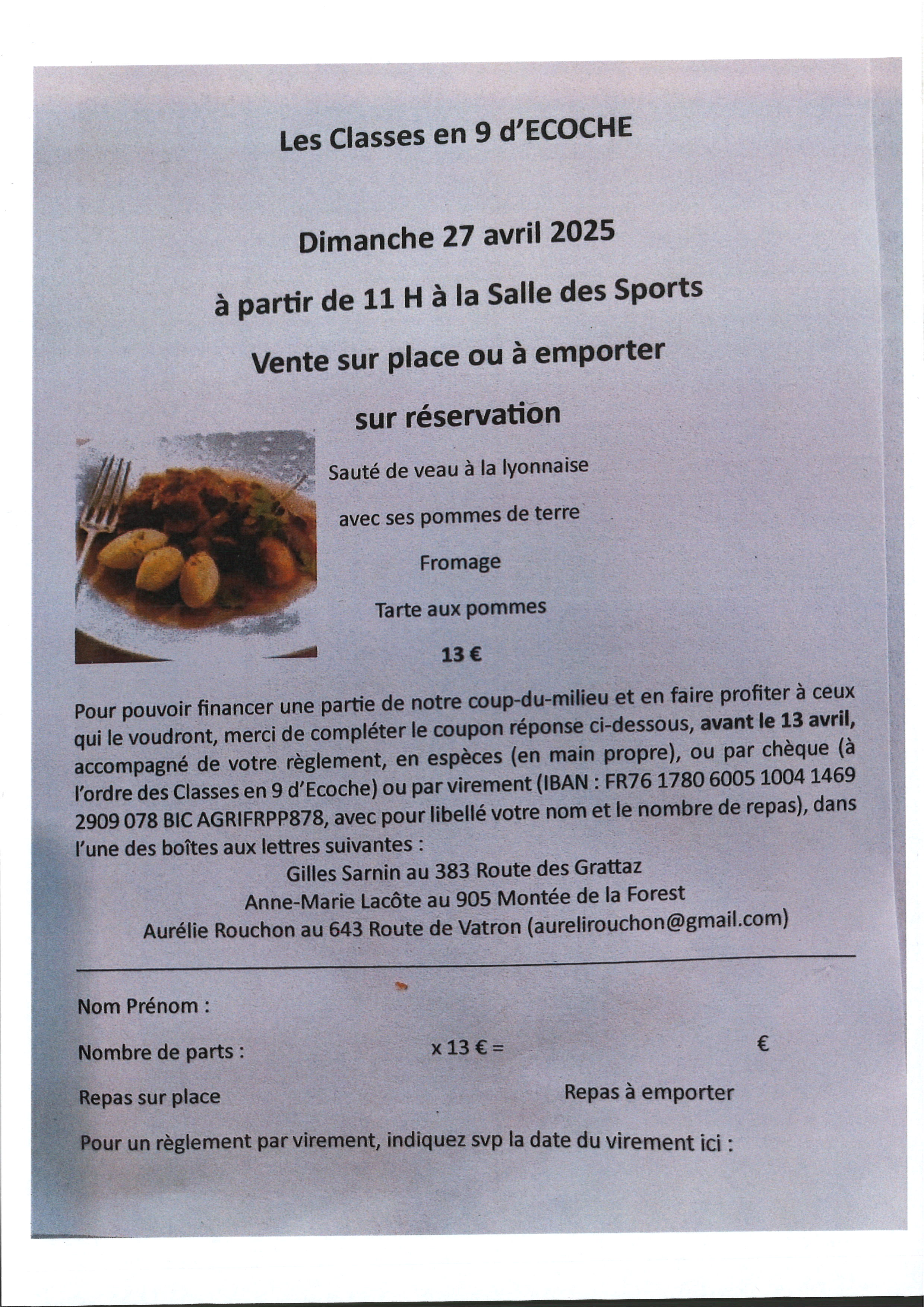 CLASSES EN 9 – VENTE DE REPAS LE DIMANCHE 27 AVRIL 2025