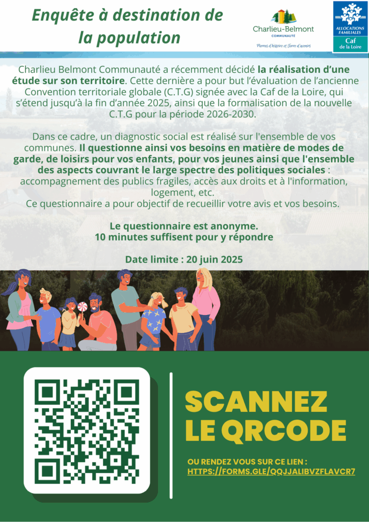 Charlieu Belmont Communauté réalise une étude, pour laquelle elle recueille vos avis et besoins, dans le cadre des conventions territoriales globales, comme : les modes de garde, les loisirs, l’accès aux droits, l’accompagnement des publics fragiles, le logement…