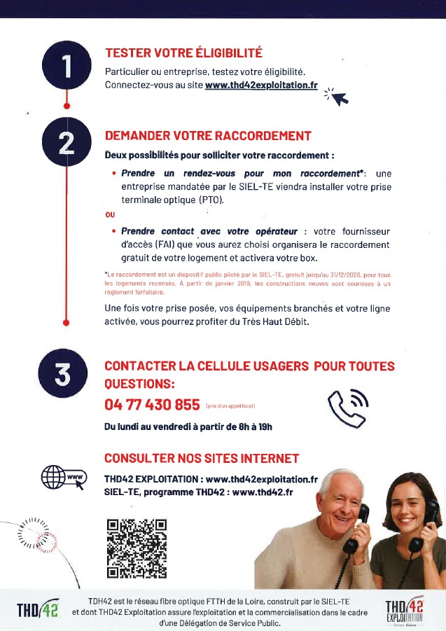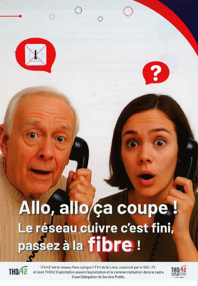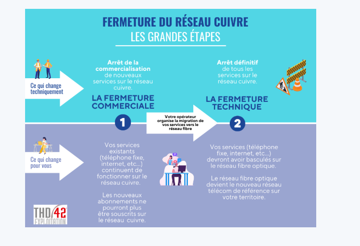 Il n’est plus possible de souscrire un nouvel abonnement (tél fixe ou internet) sur le réseau cuivre depuis le 31/01/2026 (fin de commercialisation) sur Ecoche. La fermeture technique, quant à elle, est prévue au 31/01/2019 c’est-à-dire que les personnes ayant des abonnements cuivre (téléphone ou ADSL) n’auront plus rien à compter du 31/01/2029. Il ne leur sera plus possible de téléphoner (ou de recevoir des appels) d’un poste fixe. D’où l’importance de faire installer au plus vite la prise fibre par le réseau THD42 même si vous ne l’utilisez pas : elle est gratuite jusqu’au 31/12/2026. Environ 60 adresses sont concernées sur la commune.