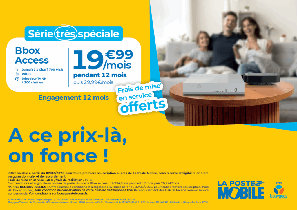 - Une offre très spéciale : Bbox Access à seulement 19,99€/mois pendant 12 mois puis 29,99€/mois.