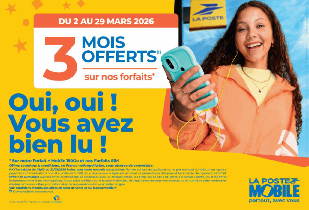 Le plus vendu : 130Go pour 10.99€/mois, forfait sans engagement, 3 mois gratuits (éventuellement 4 à voir en agence postale☺).