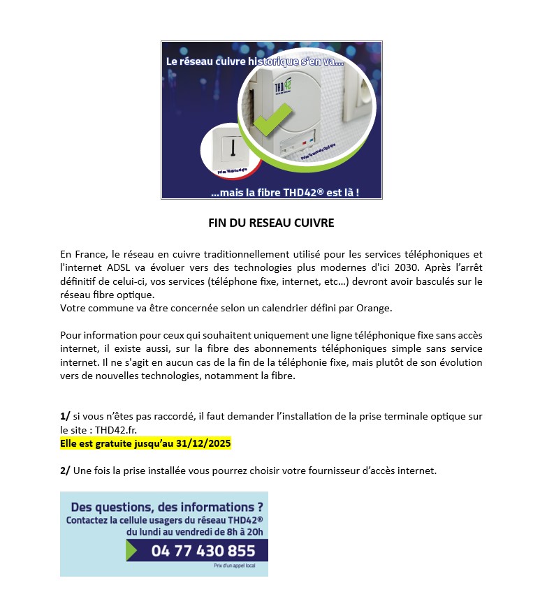 Petit rappel pour les personnes qui n’ont pas encore la prise fibre : l’installation de la prise THD42 dans votre habitation est gratuite jusqu’en décembre 2026 ; le service sera payant ensuite. Afin d’éviter l’engorgement en fin de gratuité, les personnes intéressées doivent s’inscrire le plus rapidement possible sur le site THD42 :